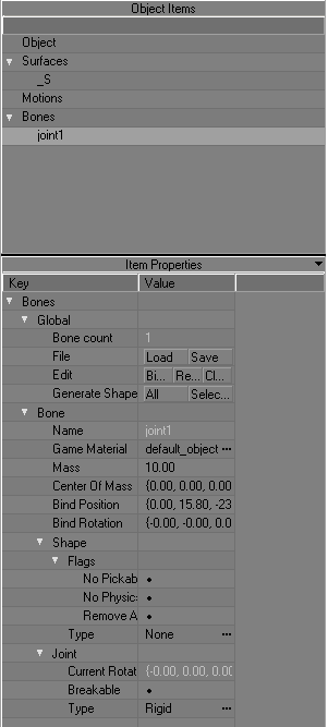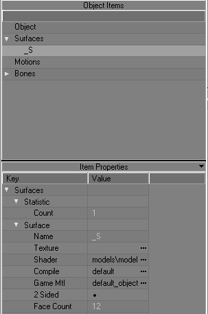 В панели Object Items видим характеристики нашего объекта (нам надо только Surfaces и Bones). В Surfaces задаются материалы и шейдеры для нашего объекта. Раскрываем Surfaces и устанавливаем параметры: Shader: models/model Compile: def_shaders/def_vertex Game Mtl: objects/small_box